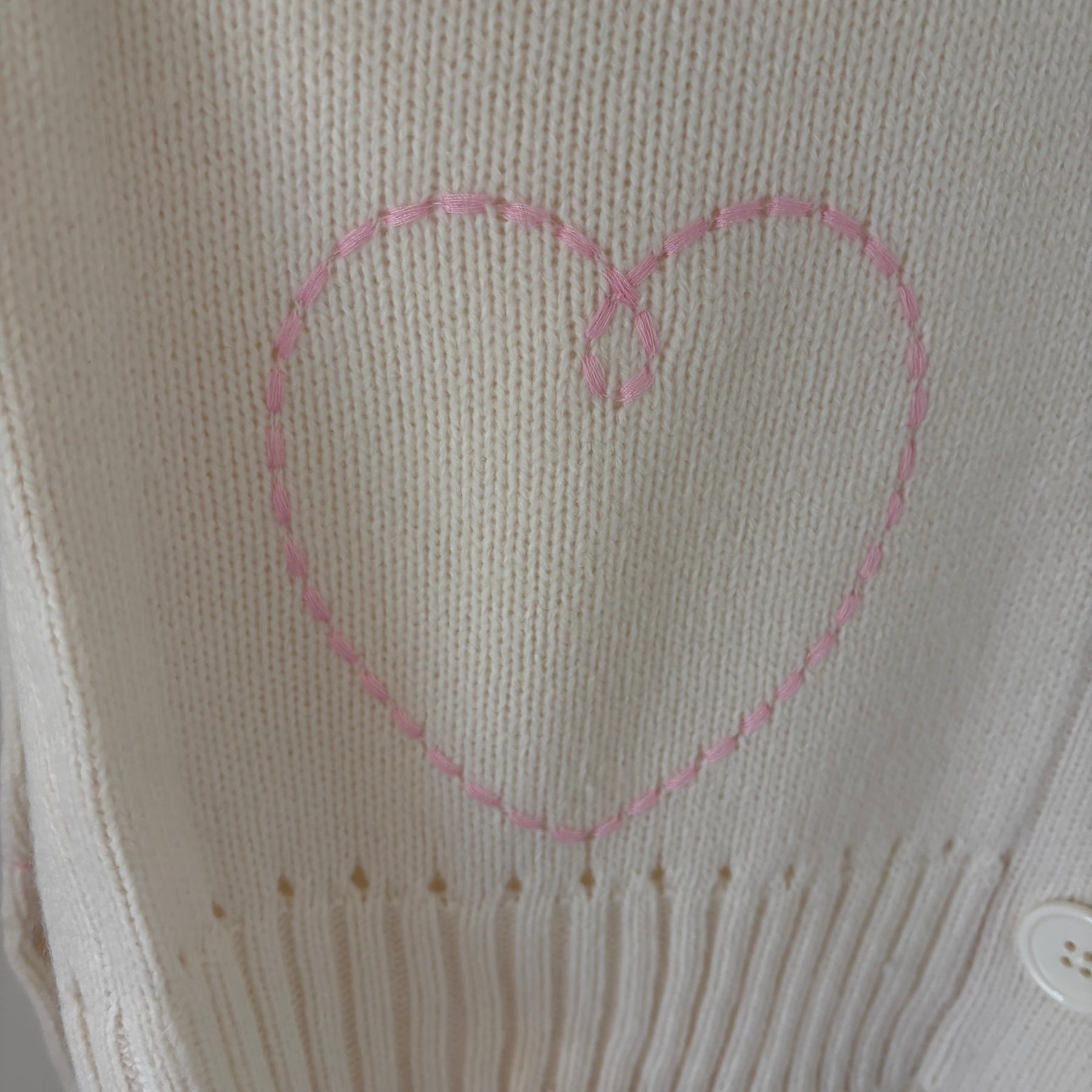 Cream button cardigan with light pink embroidered heart stitch detailing on front and sleeves.