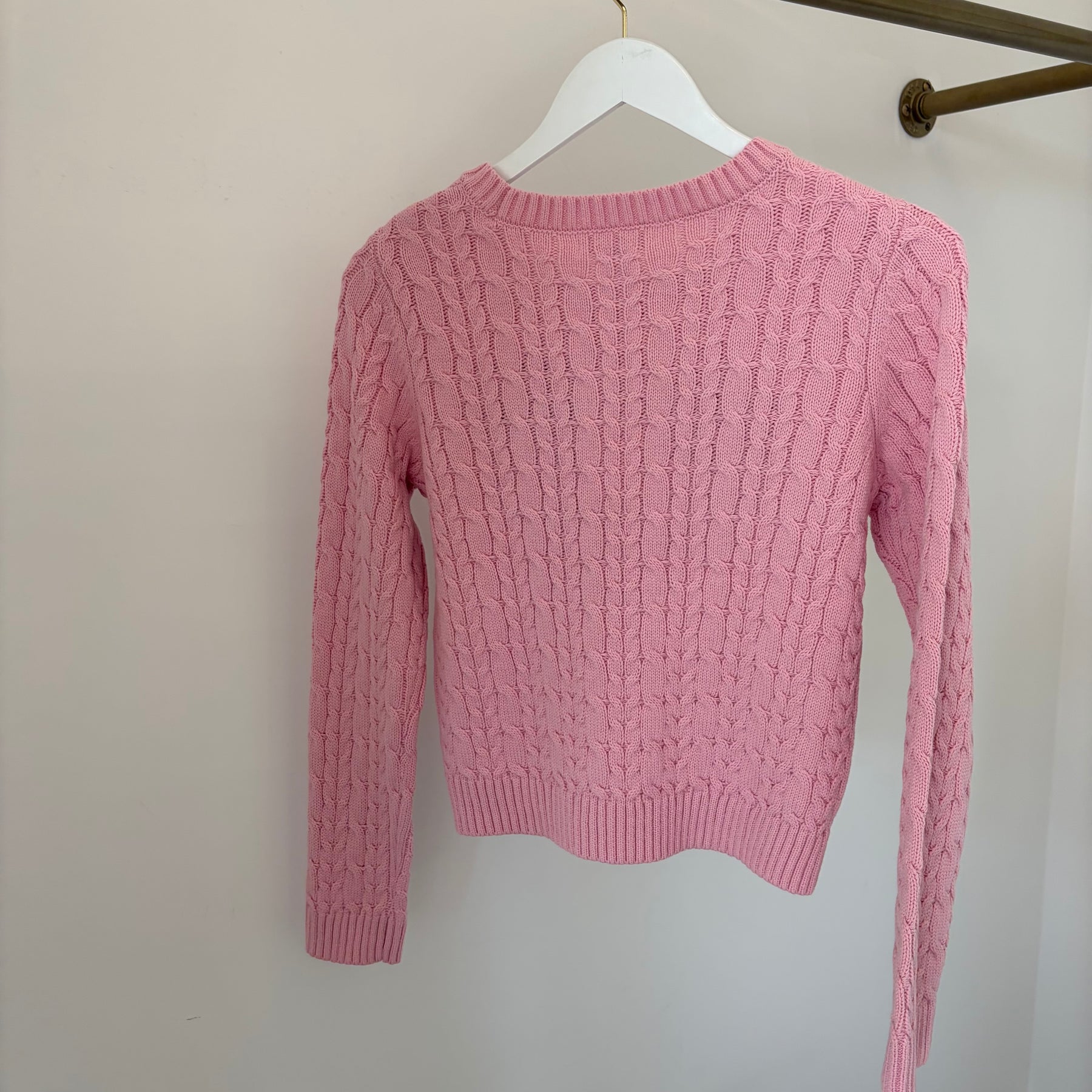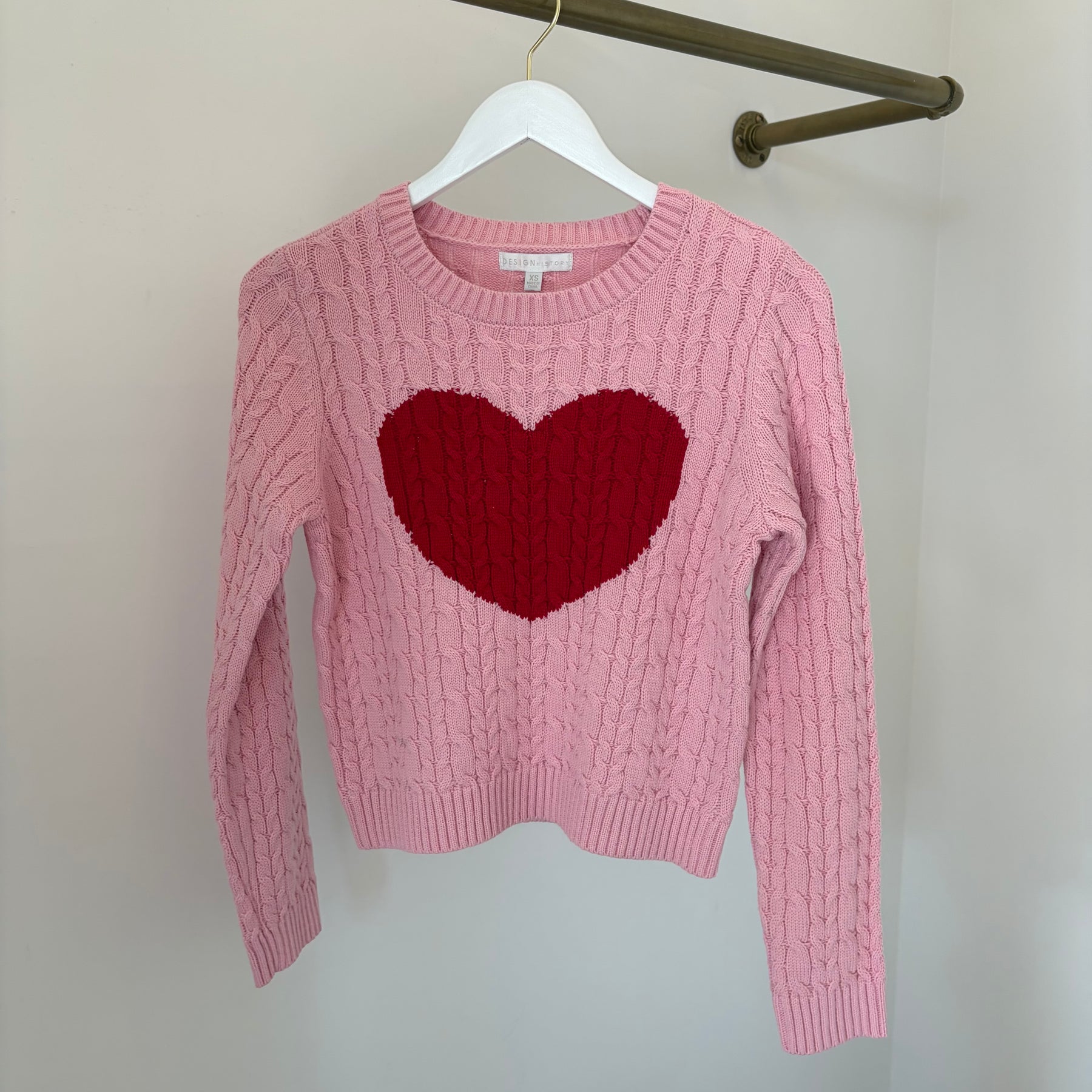 Pink cable knit sweater with center red heart. This crewneck is a versatile layering option!