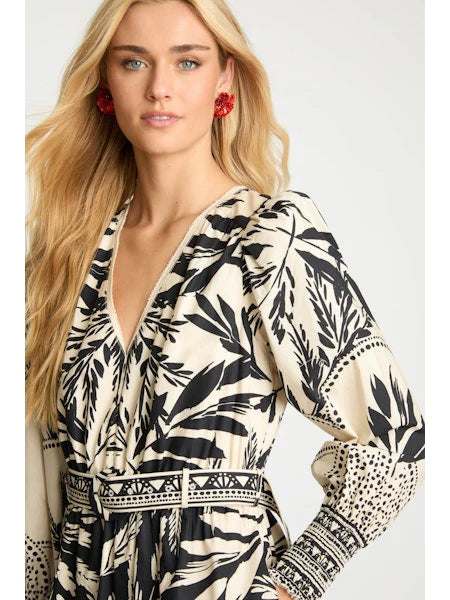 The Carly Dress in Ambergrain is an effortlessly elegant silhouette designed to make a statement. Featuring a striking leaf motif rendered in high-contrast tones, the print feels both bold and refined. A flattering V-neckline and long sleeves with elasticated cuffs create a balanced, feminine shape that’s easy to wear.