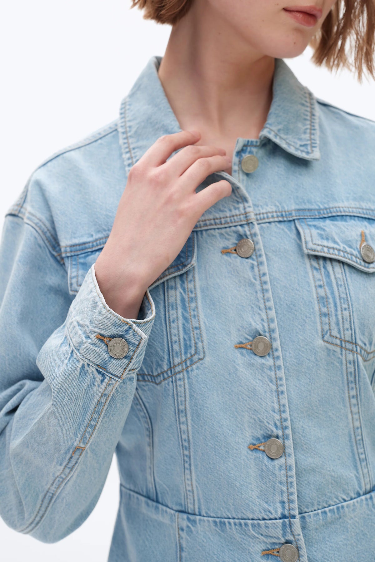 Elevate your style with this long sleeve mini dress. This women's denim dress features a button-up front and light wash for an effortless, chic look. Light Blue.