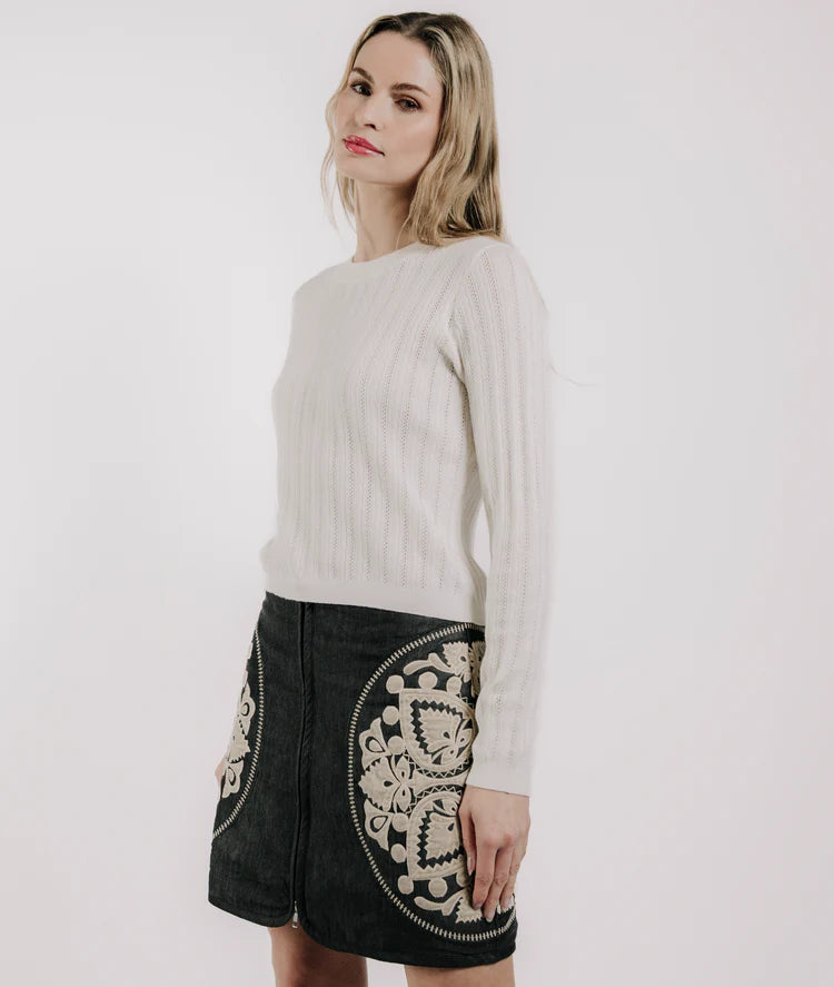 • The Ayla Skirt is a standout piece featuring enlarged velvet ivory applique that adds a modern artisanal touch to a classic silhouette. With its front zip closure and flattering fit the Ayla Skirt transitions seamlessly from daywear to evening style.