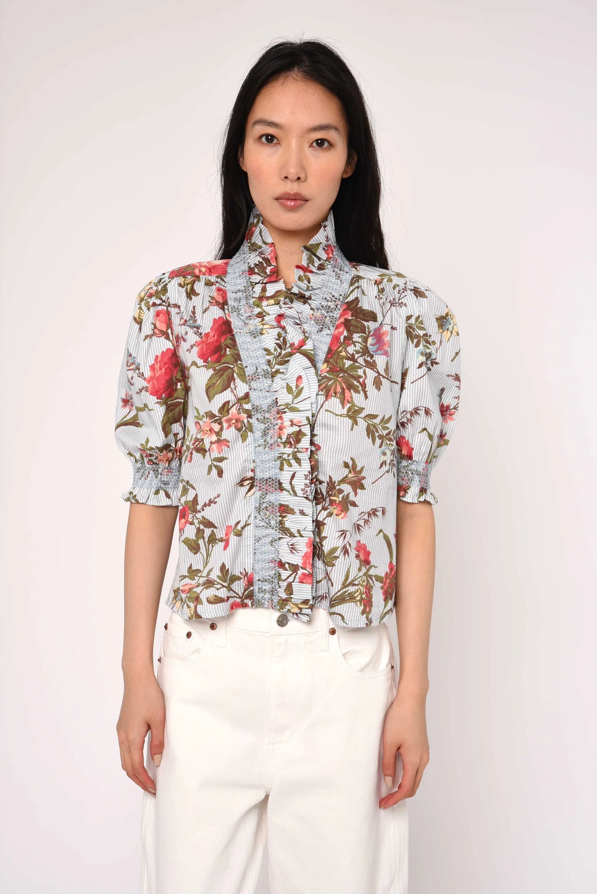 The Zuri Top! Loved for its ruffled neckline and center front smocked placket, it features a functional placket with signature shell buttons and decorative smocking at the puff sleeves.