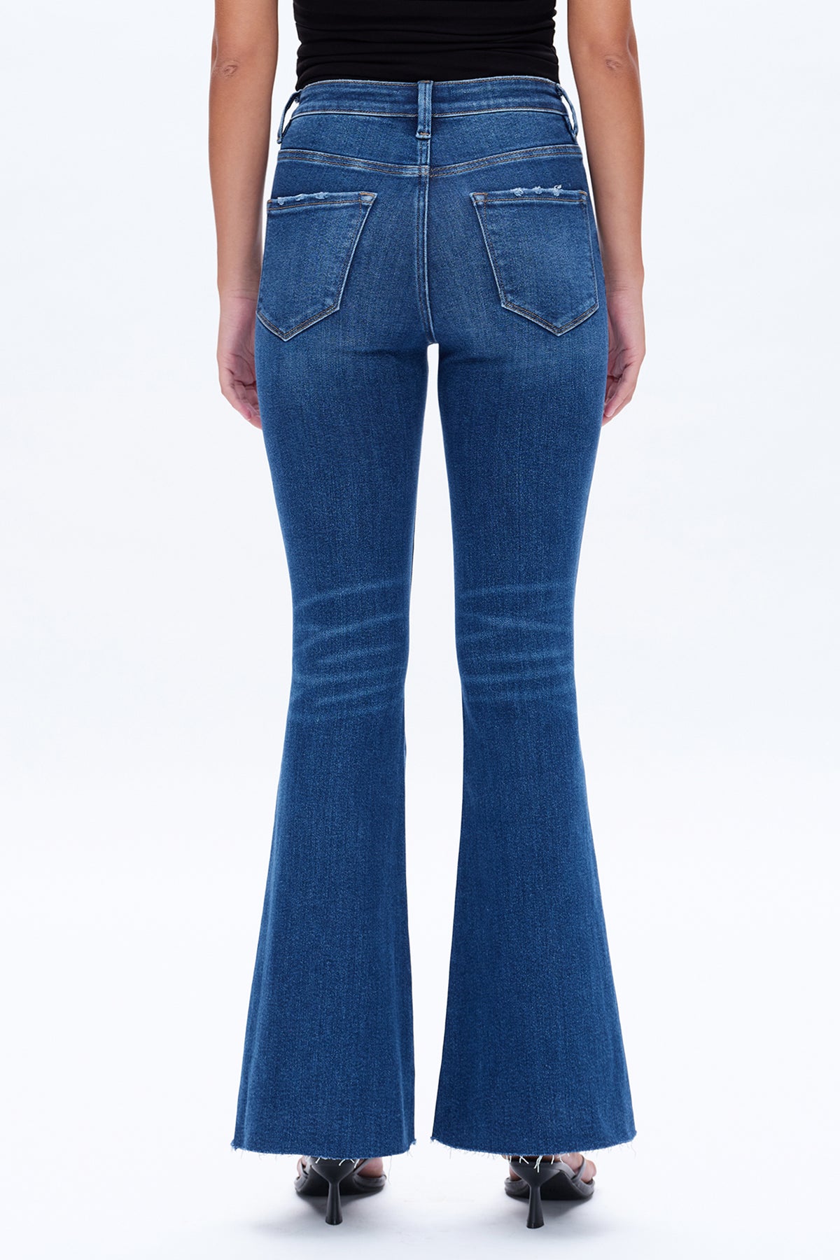 Wide flare legs and raw hems add boho charm to these high-waist jeans made from soft stretch denim in a classic faded finish.