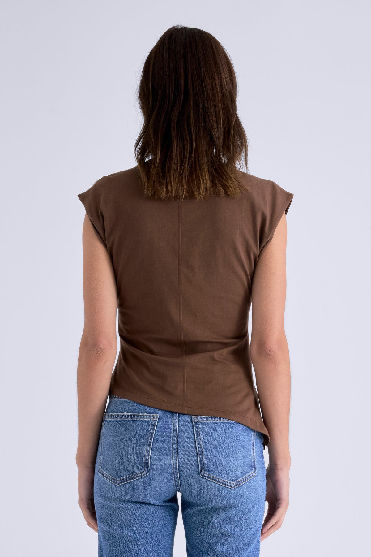 Nya brings modern attitude to the classic tee with a bold capped shoulder, shirred bodice, and asymmetric hem. Cut from 100% cotton in a java brown, this soft, versatile piece blends comfort and elevated detail for every day…and night.