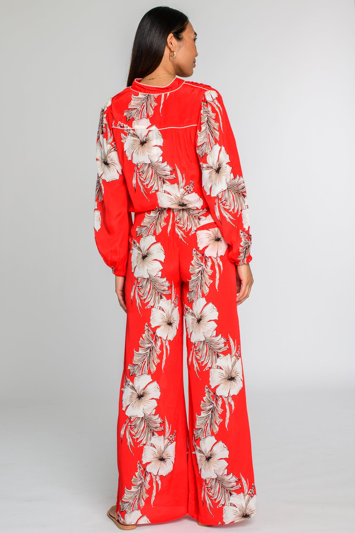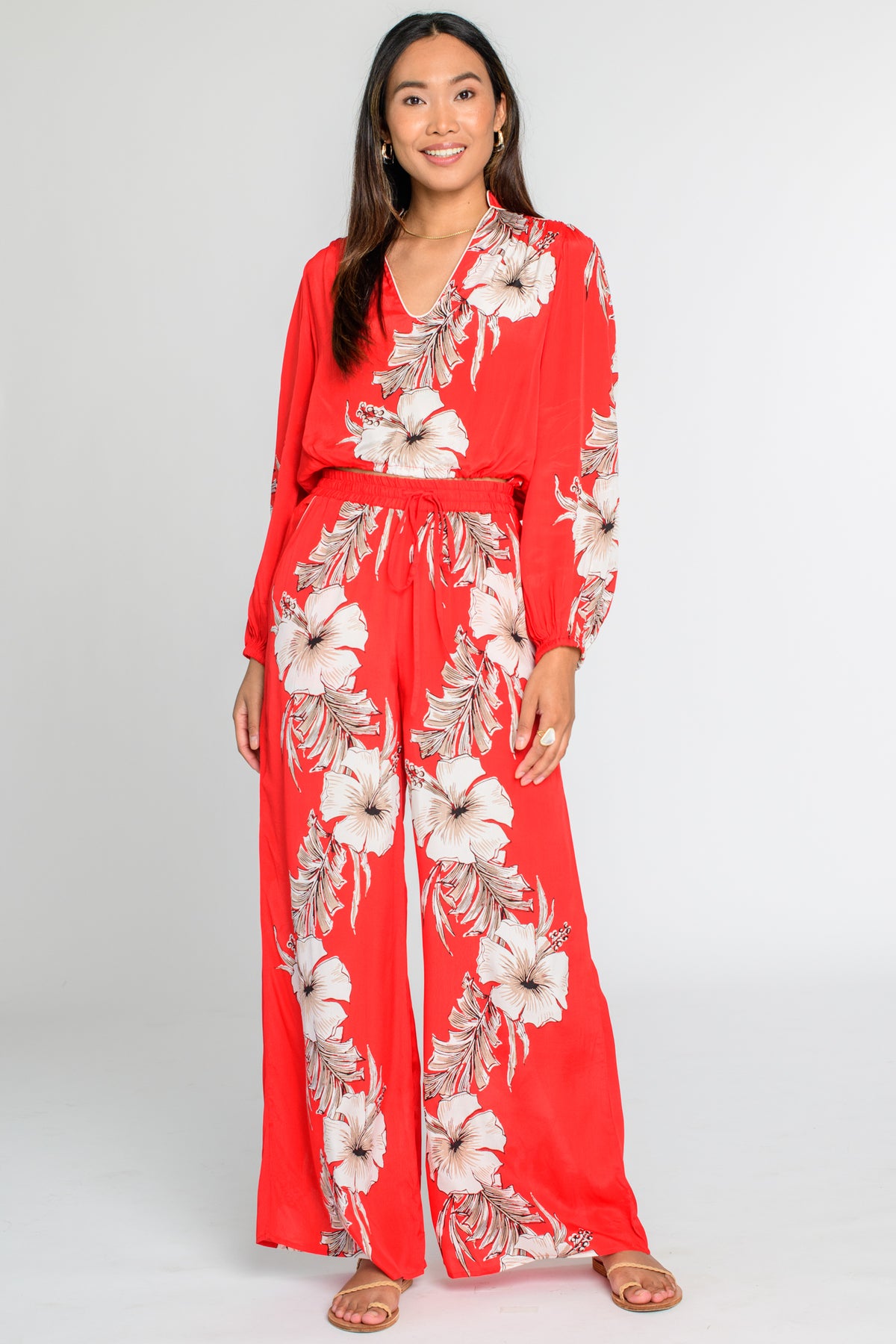 How cute is Chrissy in this vibrant red Tropicalia print! She is a waist length blouse with a mandarin collar, rounded V neckline, balloon sleeves, and a drawstring tie waist. Wear her as part of a matching set or with your favorite high waisted denim.