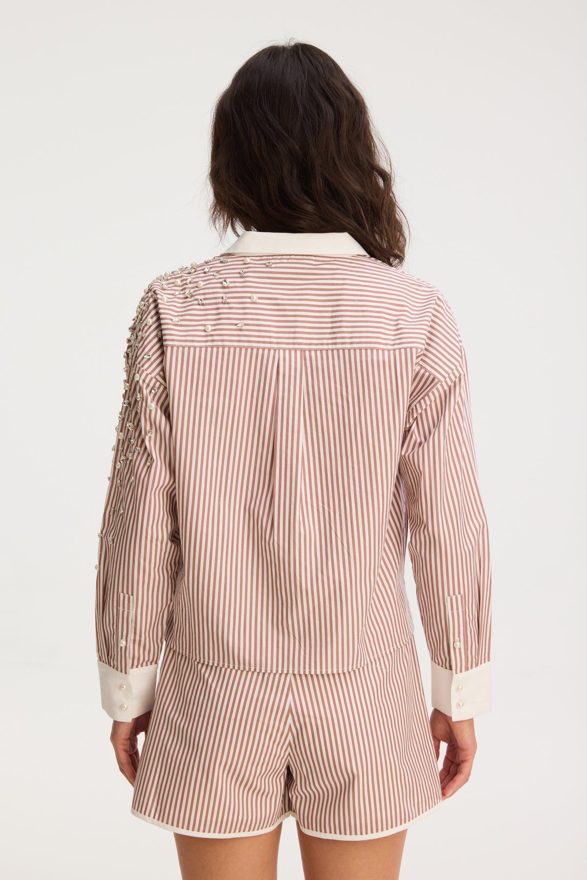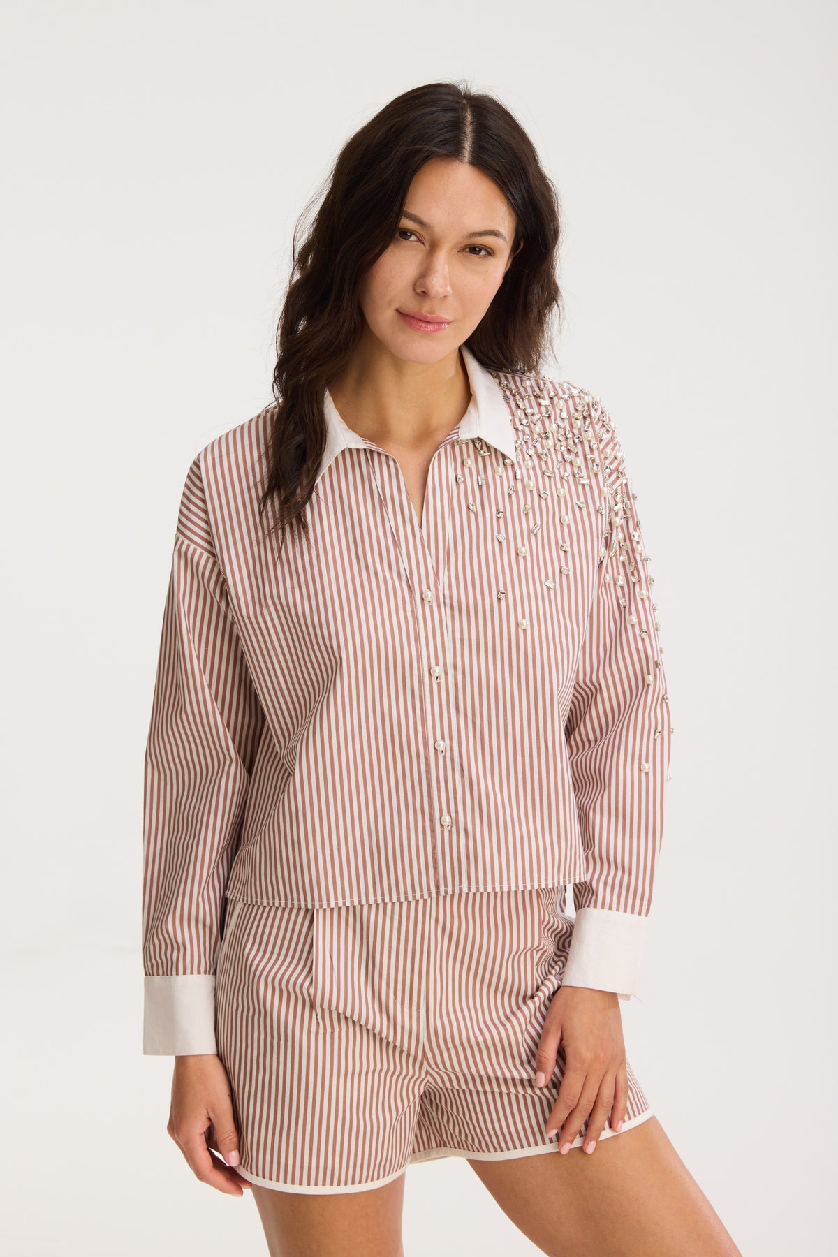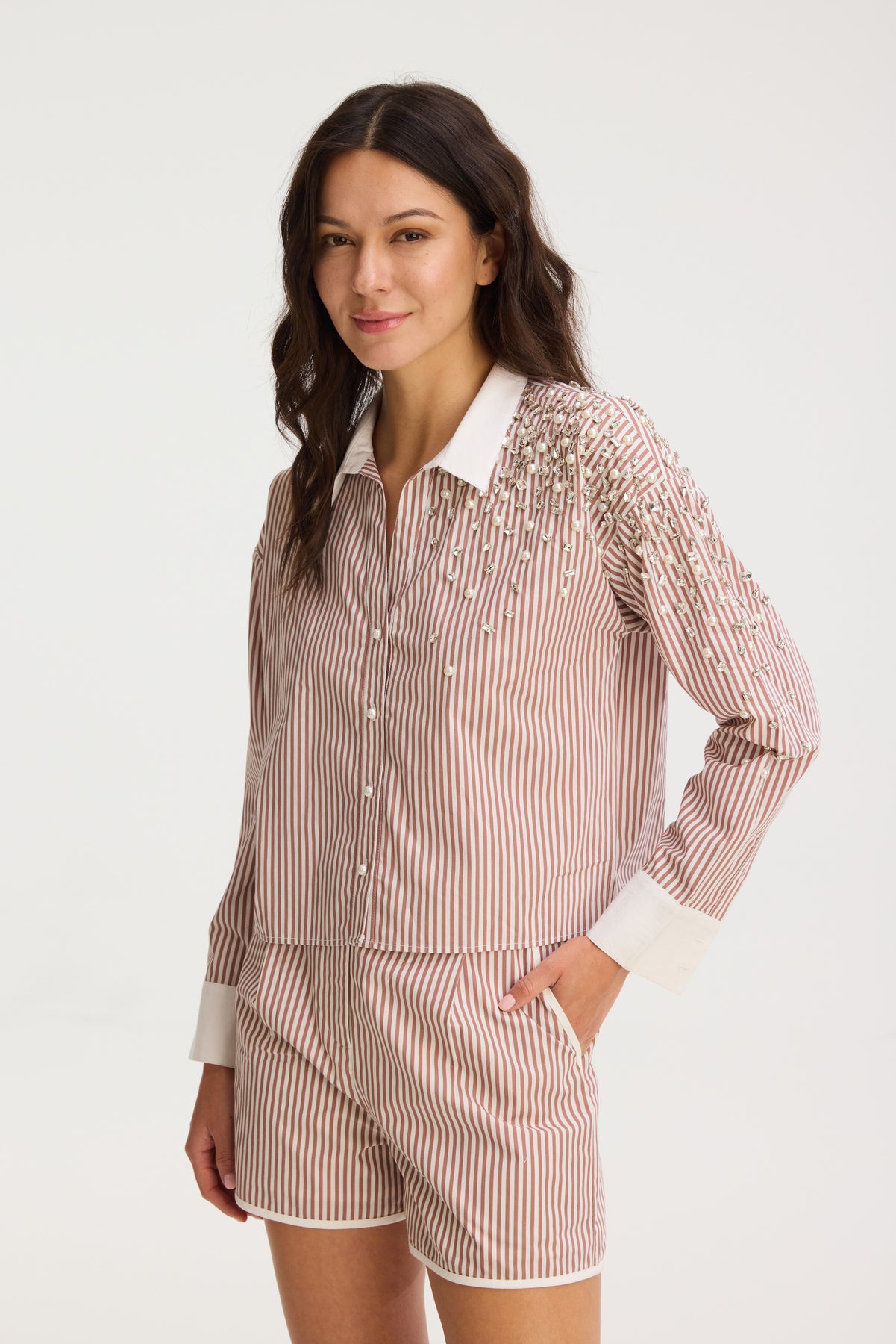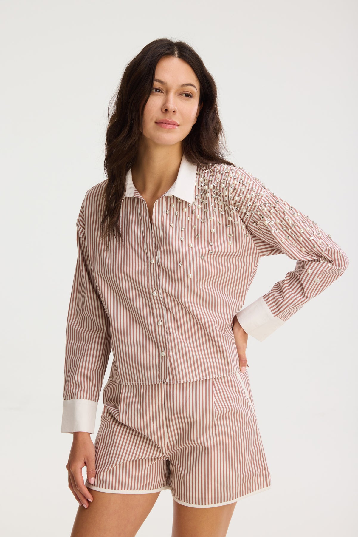 The Allison Rhinestone Emily Top transforms an everyday classic into a statement piece. Hand-sewn rhinestones and pearls cascade across the shoulder and sleeve, catching light with every movement. Crafted from crisp cotton poplin, this top features a flattering slightly cropped and boxy silhouette that works effortlessly from day to night. Contrasting collar and cuffs add polish and dimension. Perfect for elevating your basics into something truly unforgettable.